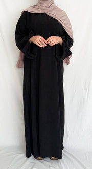 Optez pour une allure élégante et confortable avec cette robe longue noire en effet côtelé, repensée pour allier style et élégance.